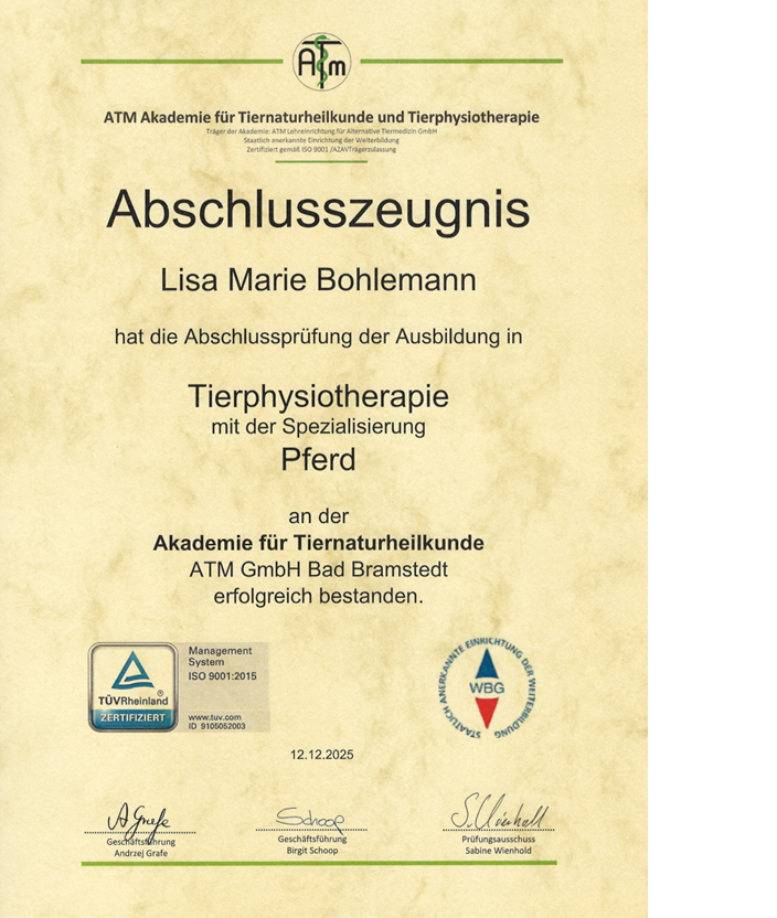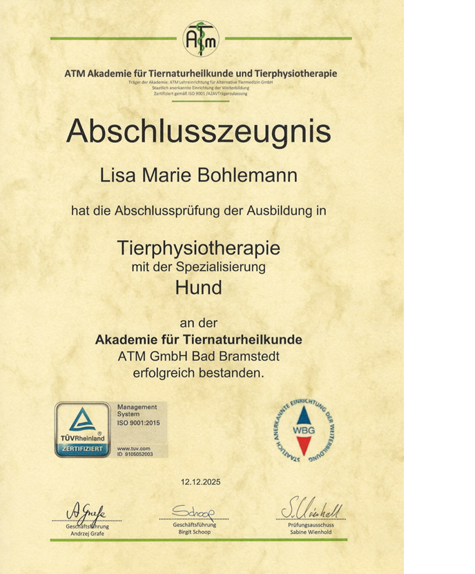 Mein Name ist Lisa Bohlemann. Ich komme aus dem Landkreis Rotenburg und bin Tierphysiotherapeutin für Hunde, Katzen und Pferde.